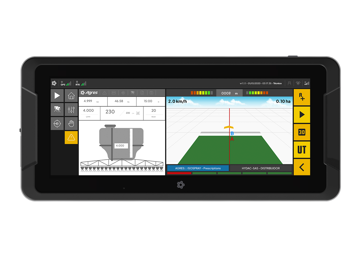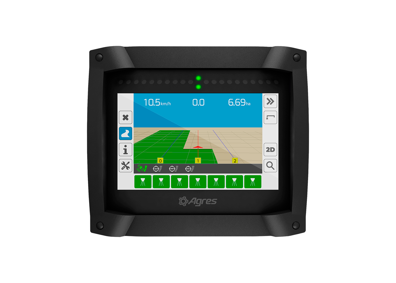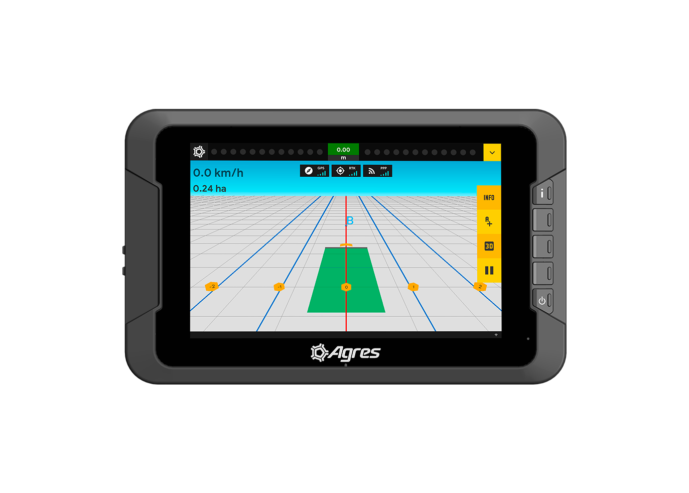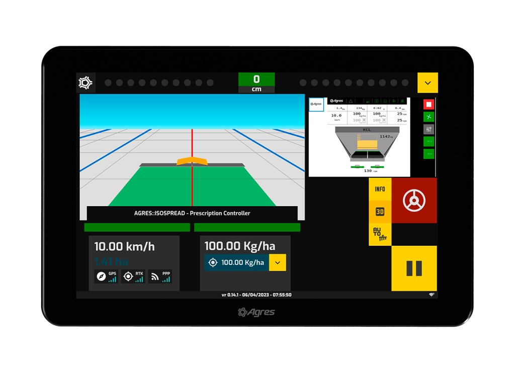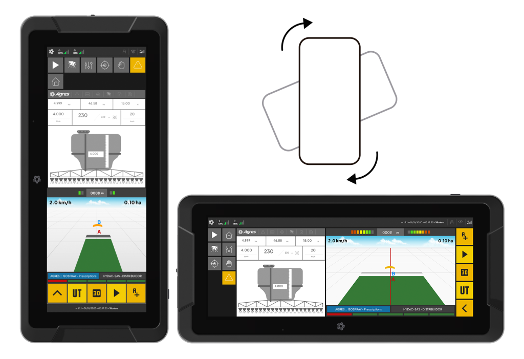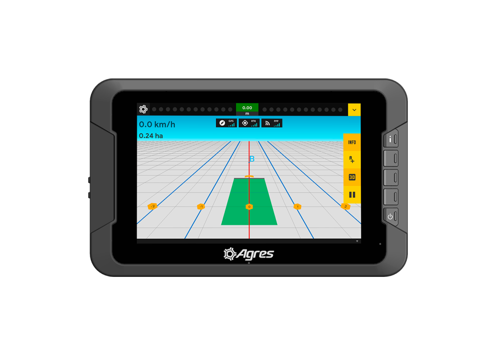 O agroNave 12 UltraWide This is Agres' premium on-board computer. Its 12-inch UltraWide screen offers a more advanced visual experience, with an expanded view of the map, implement controls, and operating data, ensuring clarity even in high light conditions and comfort for long journeys.