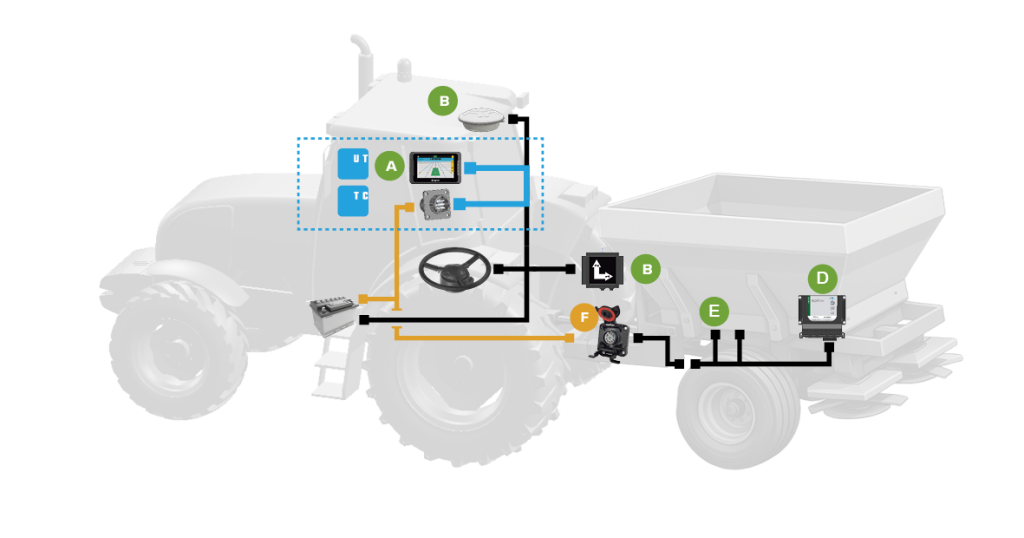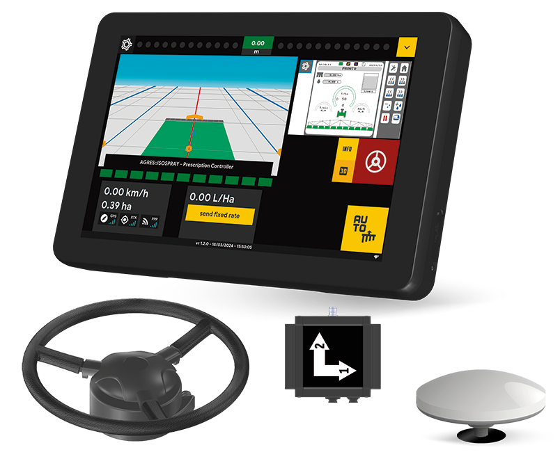 Transform your operations with the system that includes the AgroNave 7, the ANR 10 antenna, the ANP 21 terrain compensator, the electric autopilot, the ISOBUS retrofit cable, and the isoBox Spreader ECU for fertilization control with up to 4 controls.