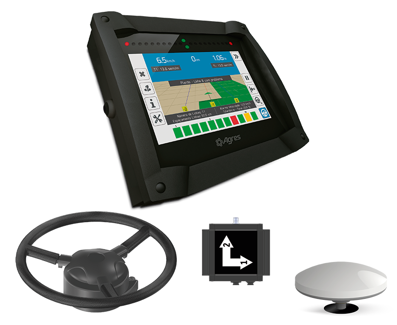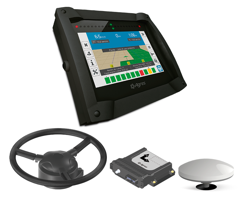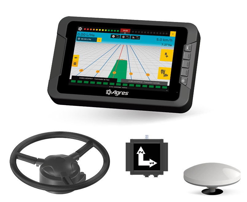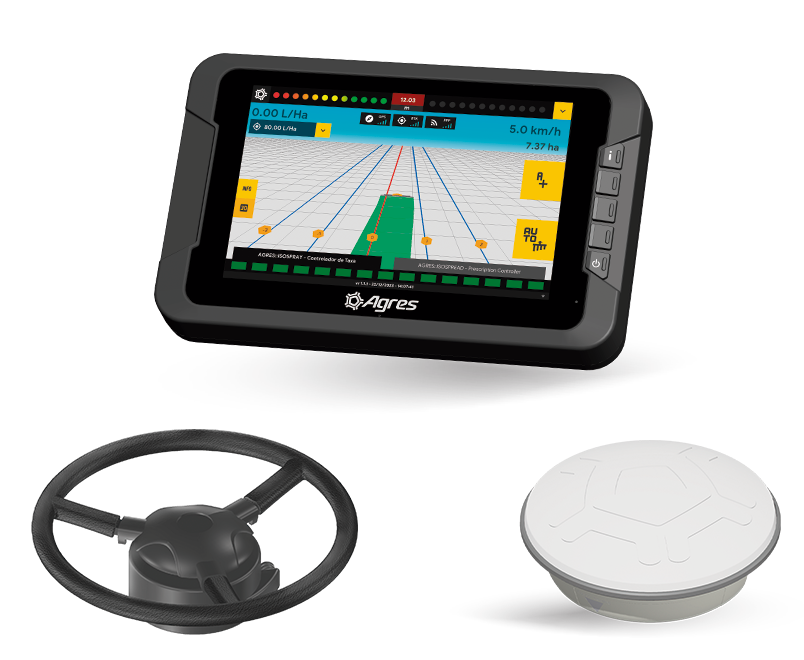 It provides efficient and precise navigation, with easy installation of the electric pilot on various types of tractors. It offers section, track, gate and disc controls, as well as advanced guidance options, delivering a complete solution for fertilization control with integrated connectivity.