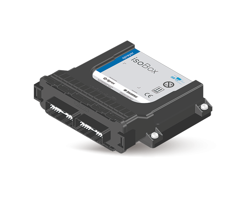 The ECU isoBox Sprayer, with ISOBUS technology, precisely controls the application of liquids, ensuring efficient and uniform spraying. It allows automatic flow and section control, use of prescription maps, and flexible configuration for different types of machines, optimizing the use of inputs.