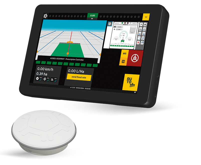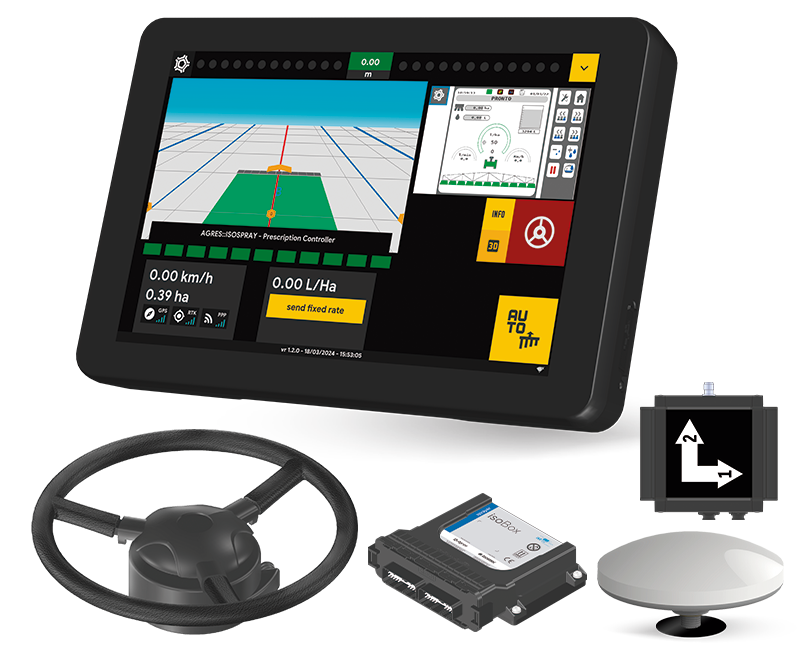The isoView, combined with the ANR 10 antenna, the ANP 40 terrain compensator, the hydraulic autopilot, and the spray kit for up to 9 sections, forms a robust and efficient solution for advanced spraying.